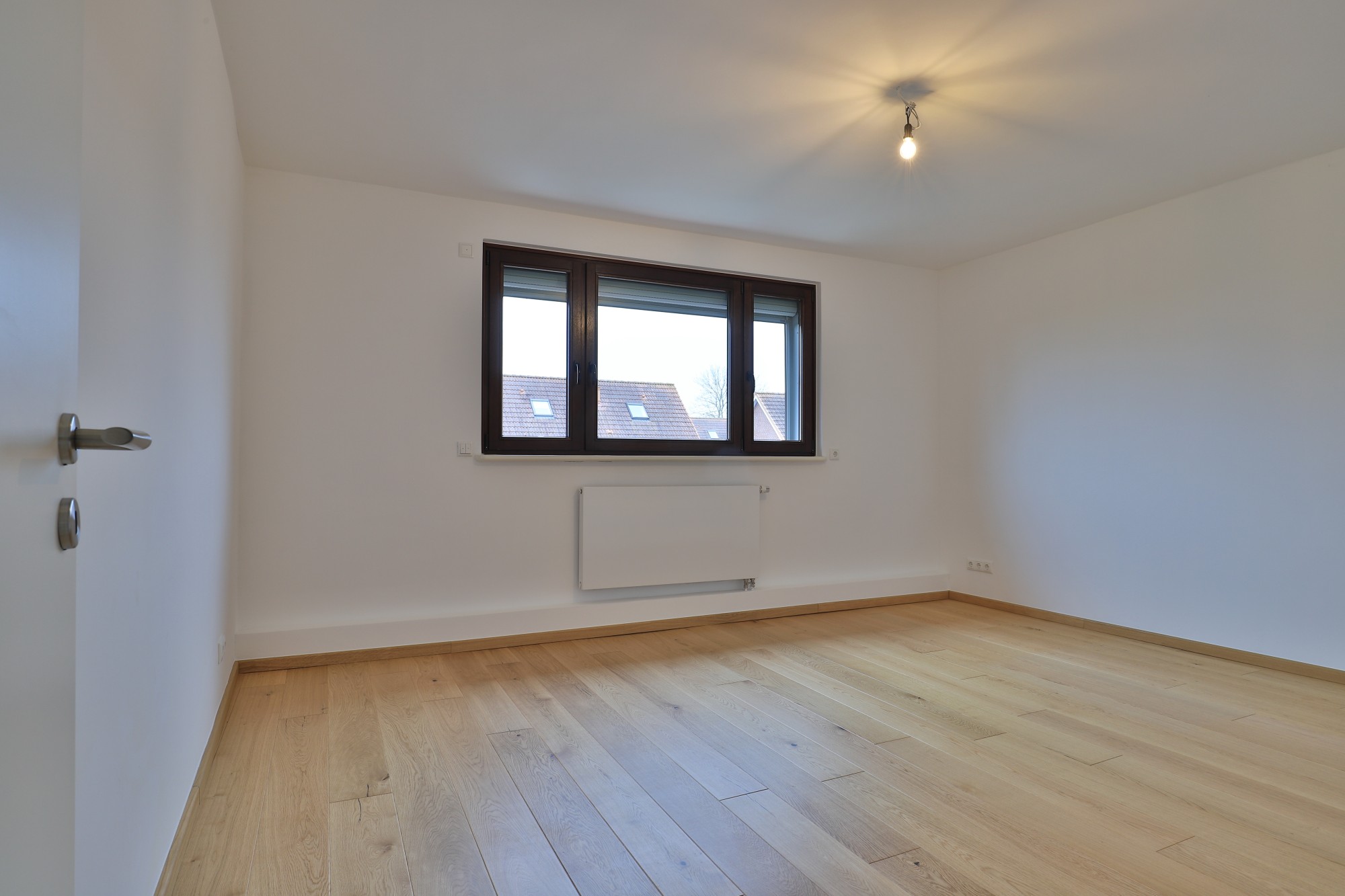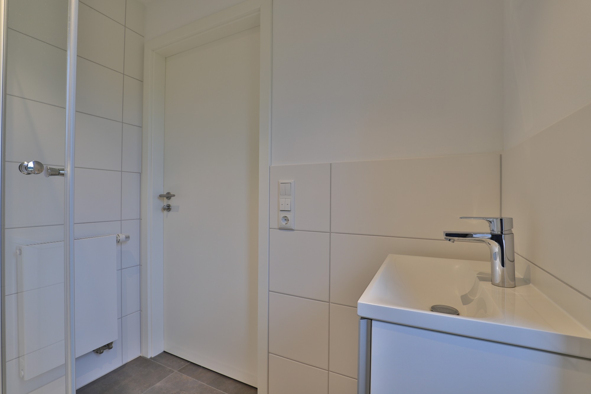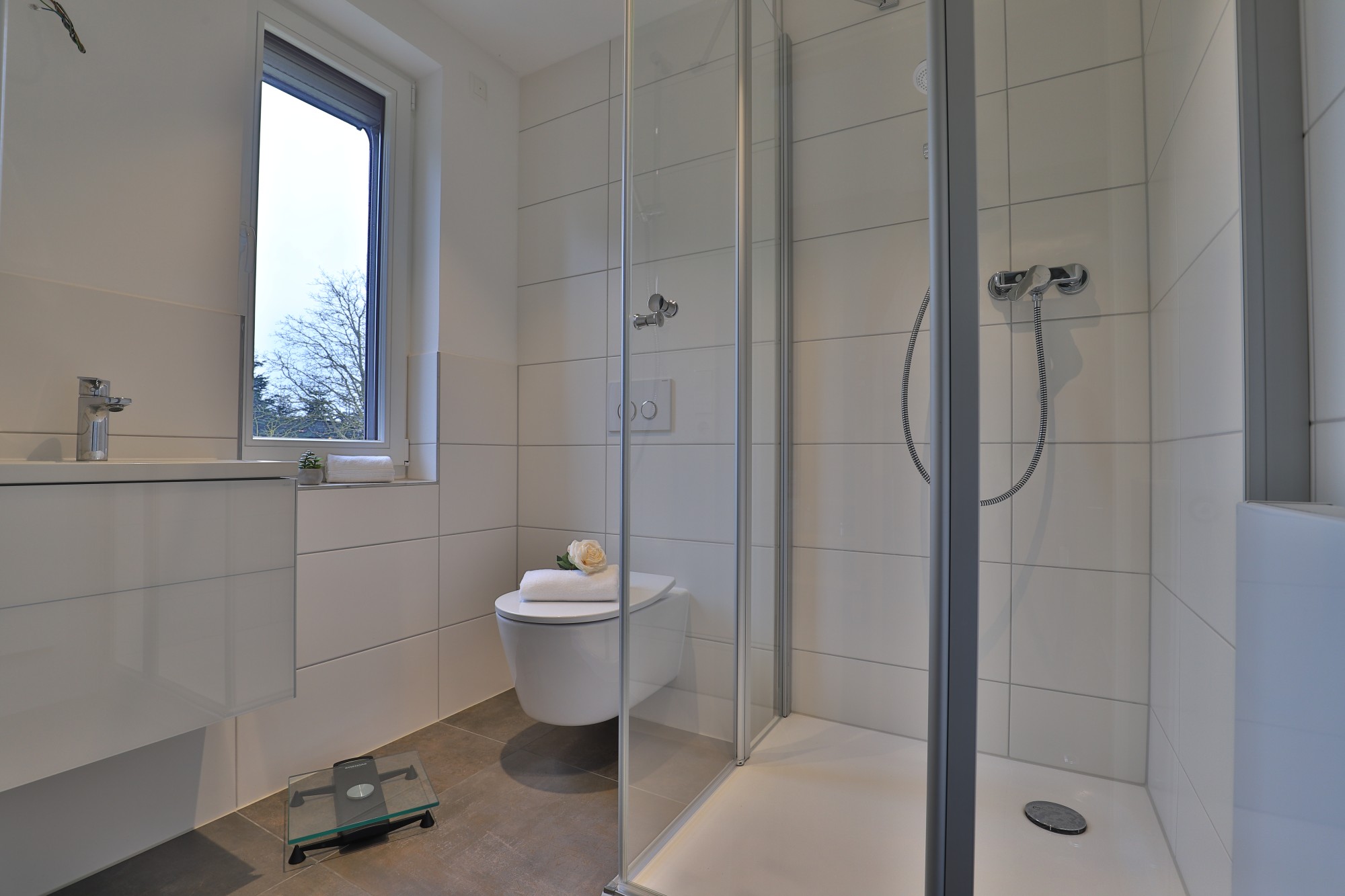 Das Tageslichtduschbad ist hell und freundlich gestaltet und bietet mit einer bodengleichen Dusche, einem randlosen WC, einem Waschtisch mit Unterbauschrank und Handtuchheizkörper einen zeitgemäßen Komfort.