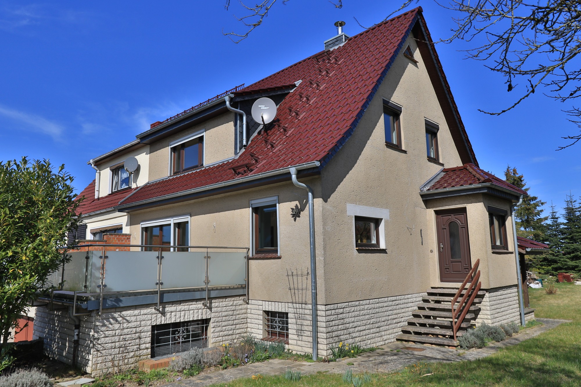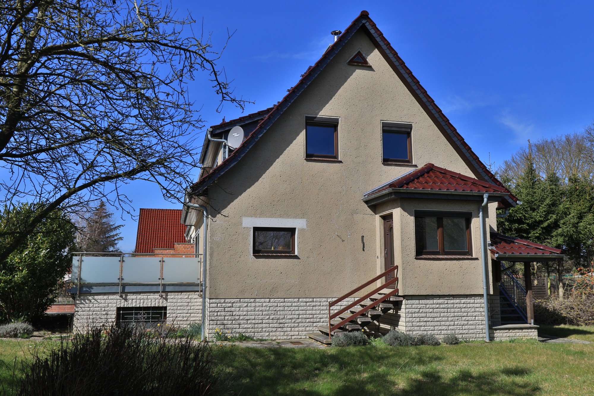 Darüber hinaus bietet das Erdgeschoss über eine verzinkte Treppe einen weiteren Ausgang/ Zugang zum Garten.