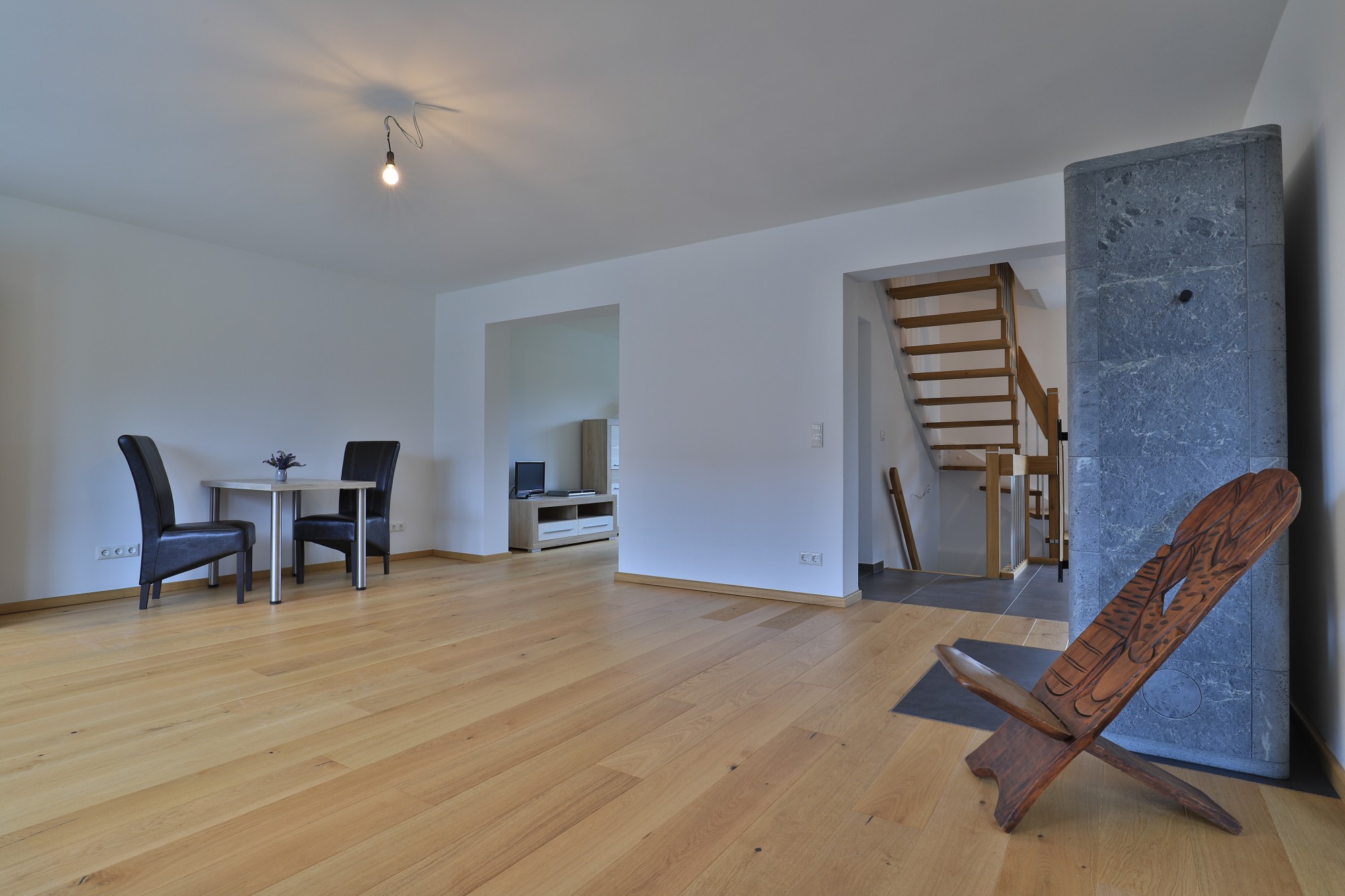 Ein großer im Wohn-/ Essbereich stehender Specksteinofen sorgt für eine behagliche Wärme und schafft eine gemütliche Atmosphäre, besonders in den kälteren Monaten des Jahres.