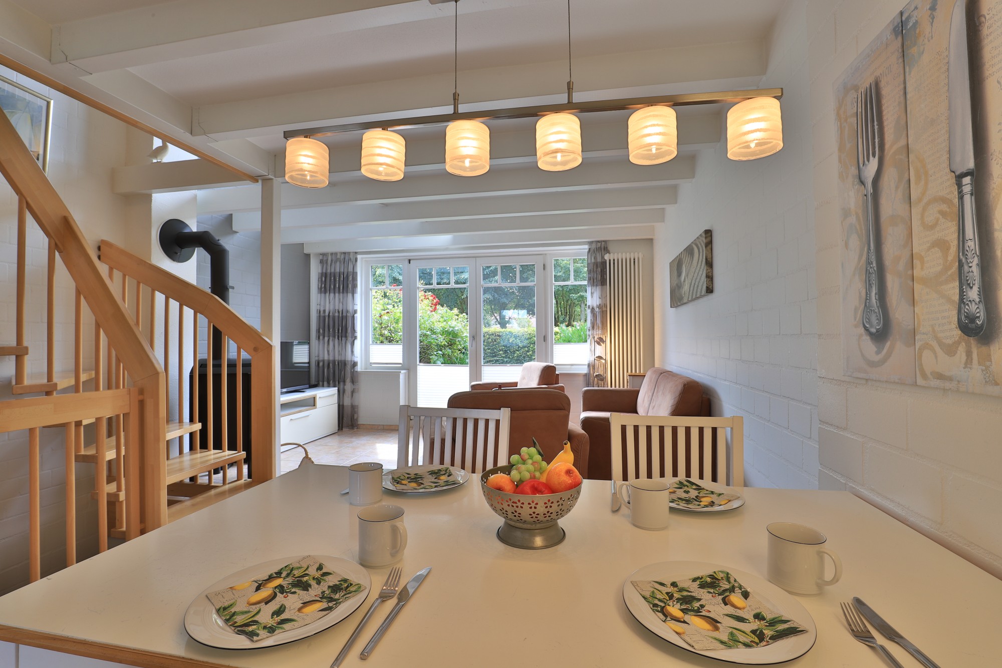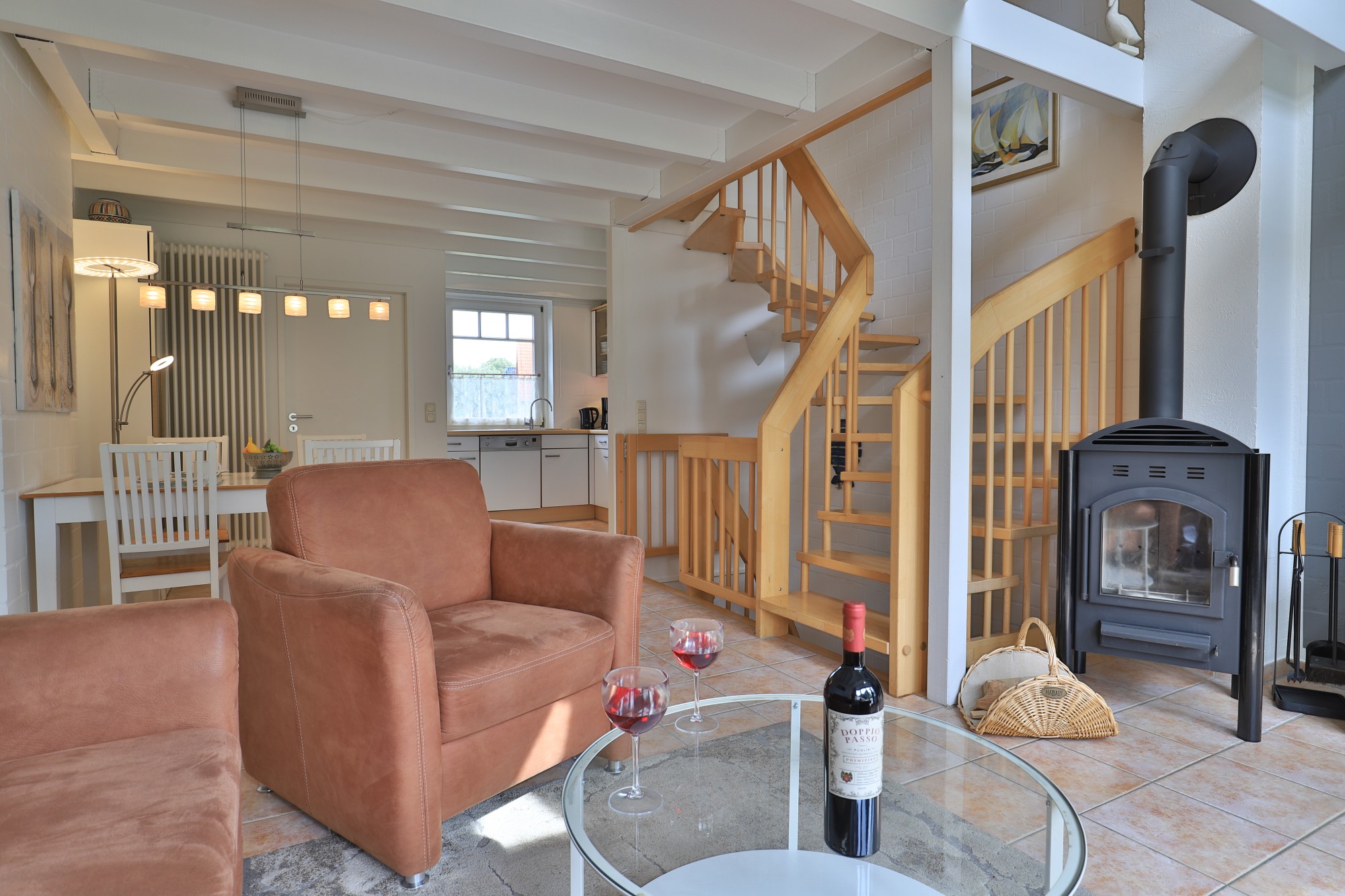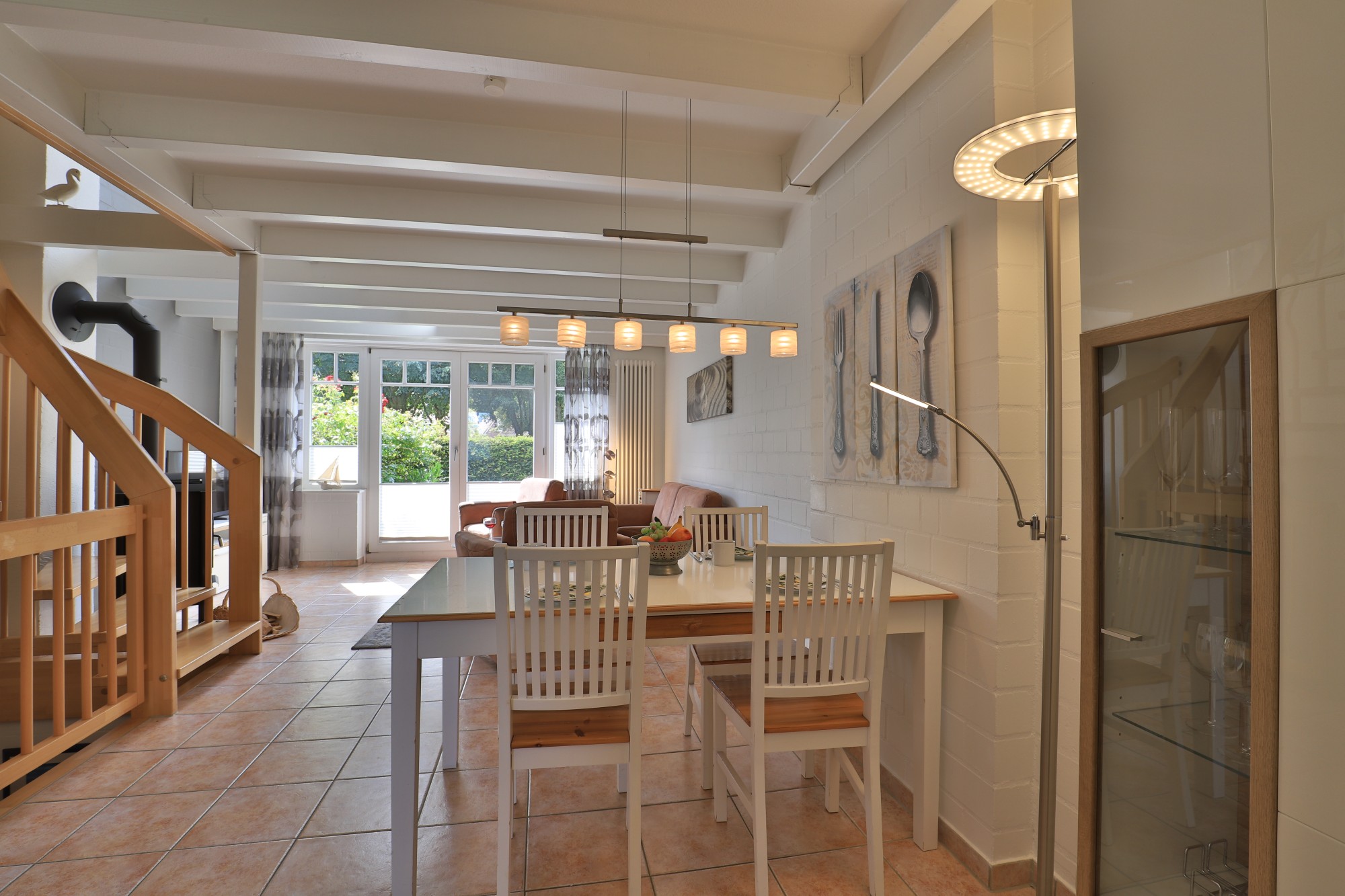 Über einen kleinen Flur/ Eingangsbereich empfängt Sie im Erdgeschoss des Reihenmittelhauses ein großzügiger sowie "offen" gestalteter Wohn-/ Essbereich mit Kaminofen und Zugang zu einer Terrasse in Südwestlage mit anliegendem Grundstücksanteil sowie einer vollständig ausgestatteten Einbauküche. Bei einem guten Buch, einem Glas Wein und knisterndem Kaminfeuer genießt man hier die Ruhe. Die sichtbaren Holzbalken im Deckenbereich verleihen dem Wohn- und Essbereich einen besonderen Charme. Im integrierten Küchenbereich bleiben kaum Wünsche offen, ausgestattet mit Geschirrspüler, Herd (Ceran), Backofen, Kühlschrank mit Gefrierfach, Mikrowelle, Kaffeemaschine, Wasserkocher, u.v.m..