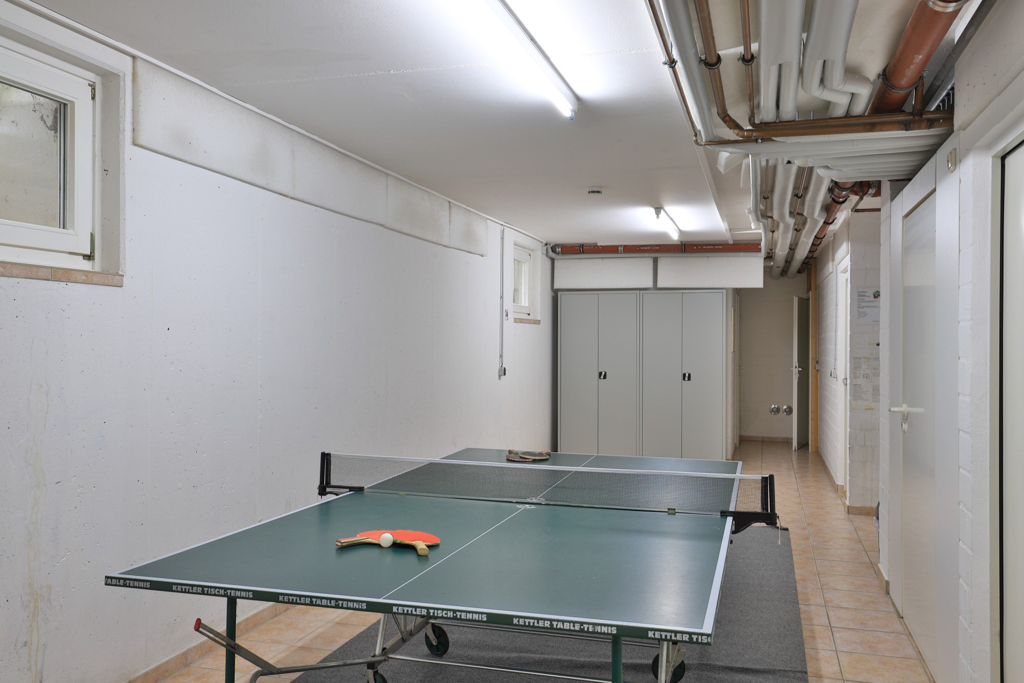 Die Reihenhausanlage ist so konzipiert, dass jede Einheit einen direkten Zugang vom Souterrain zum Gemeinschaftskeller besitzt. Hier stehen Ihnen eine Waschmaschine und ein Trockner zur gemeinschaftlichen Nutzung (gegen Gebühr) zur Verfügung. In Ihrer Freizeit kann für ein "Match" eine zur Verfügung stehende Tischtennisplatte genutzt werden.
