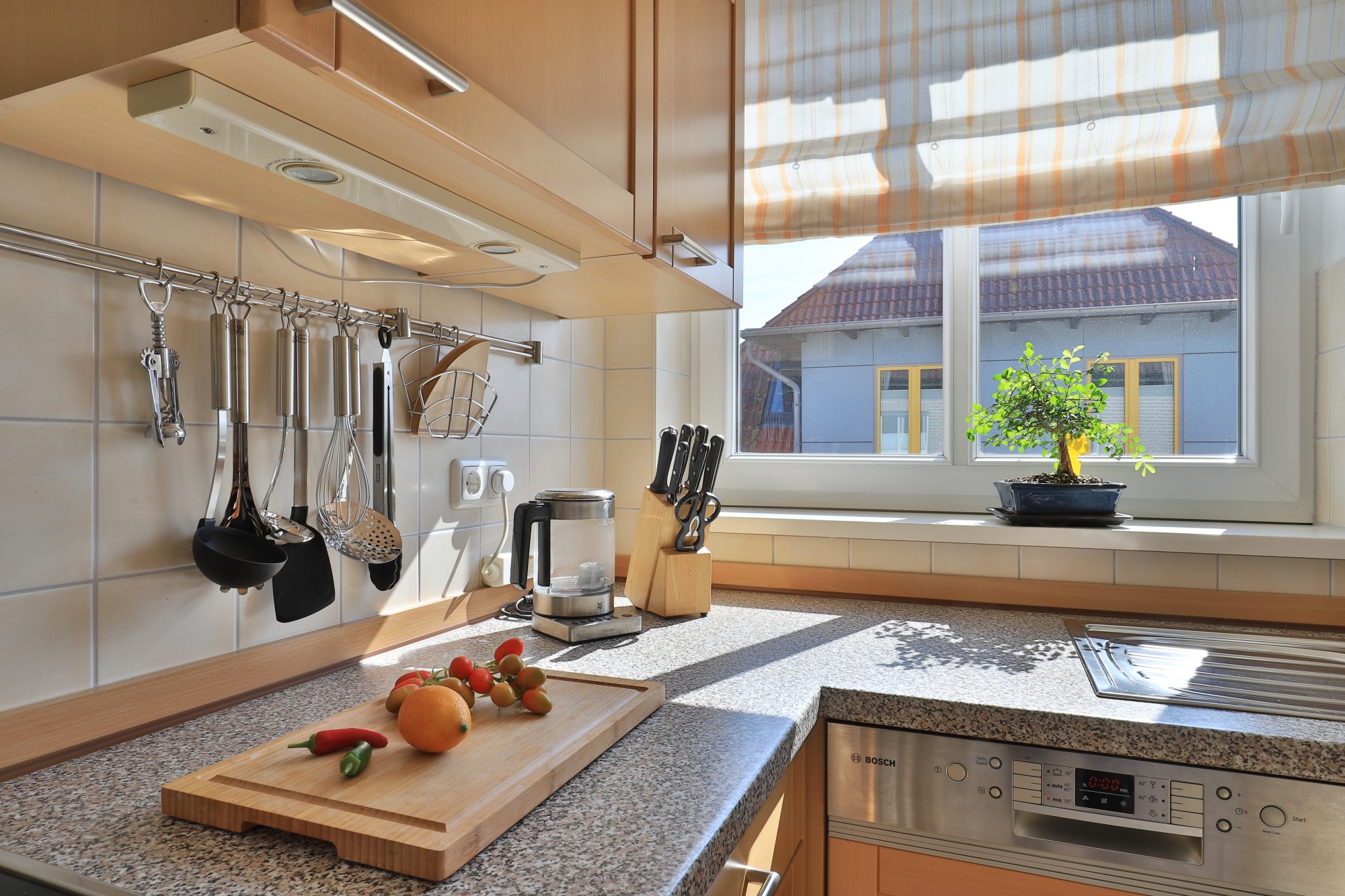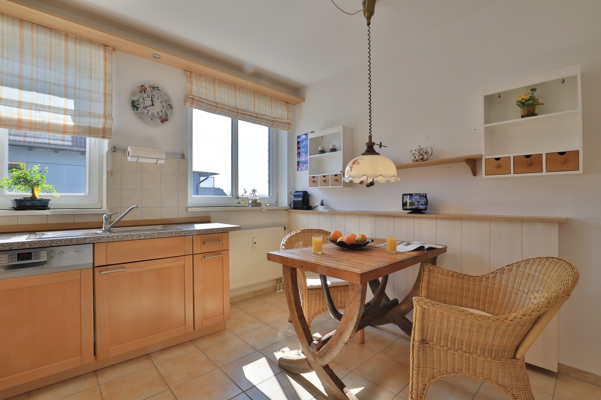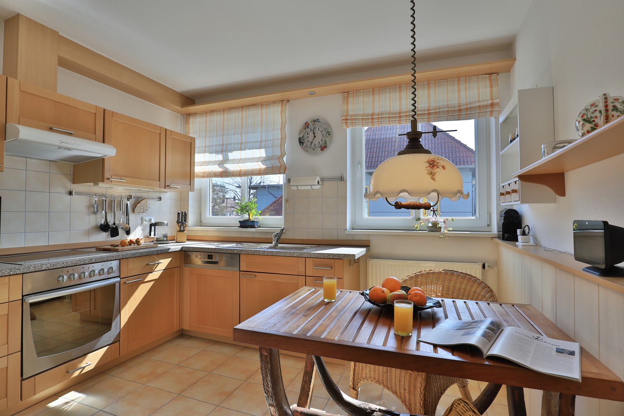 Die ebenfalls vom Flur zugängliche separate Küche ist mit einer Einbauküche ausgestattet. Ein Ceran-Kochfeld und ein Backofen sind die praktischen Helfer bei der Zubereitung Ihrer Mahlzeiten. Ebenfalls vorhanden ist ein Kühlschrank mit Gefrierfach und ein Geschirrspüler. Am Küchentisch begrüßt Sie bereits die Morgensonne bei Ihrer ersten Tasse Kaffee. Im neben der Küche befindlichen Hauswirtschafts-/ Abstellraum können z.B. Vorräte und andere Utensilien verstaut/ gelagert bzw. ein vorhandener Waschtrockner genutzt werden.