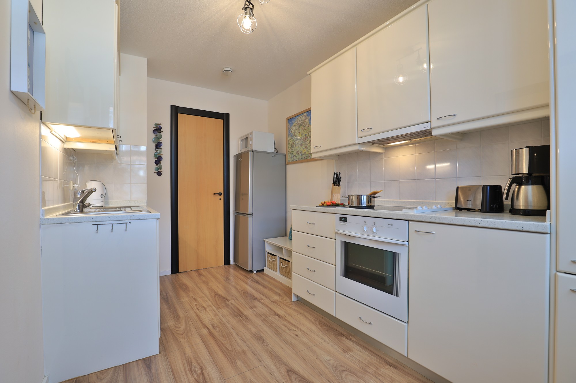 Die geschlossene Küche bietet ideale Arbeitsbedingungen für Hobbyköche. Der direkt angrenzende Abstellraum schafft wertvollen Platz für Vorräte und Haushaltsutensilien – perfekt für eine aufgeräumte Wohnatmosphäre.