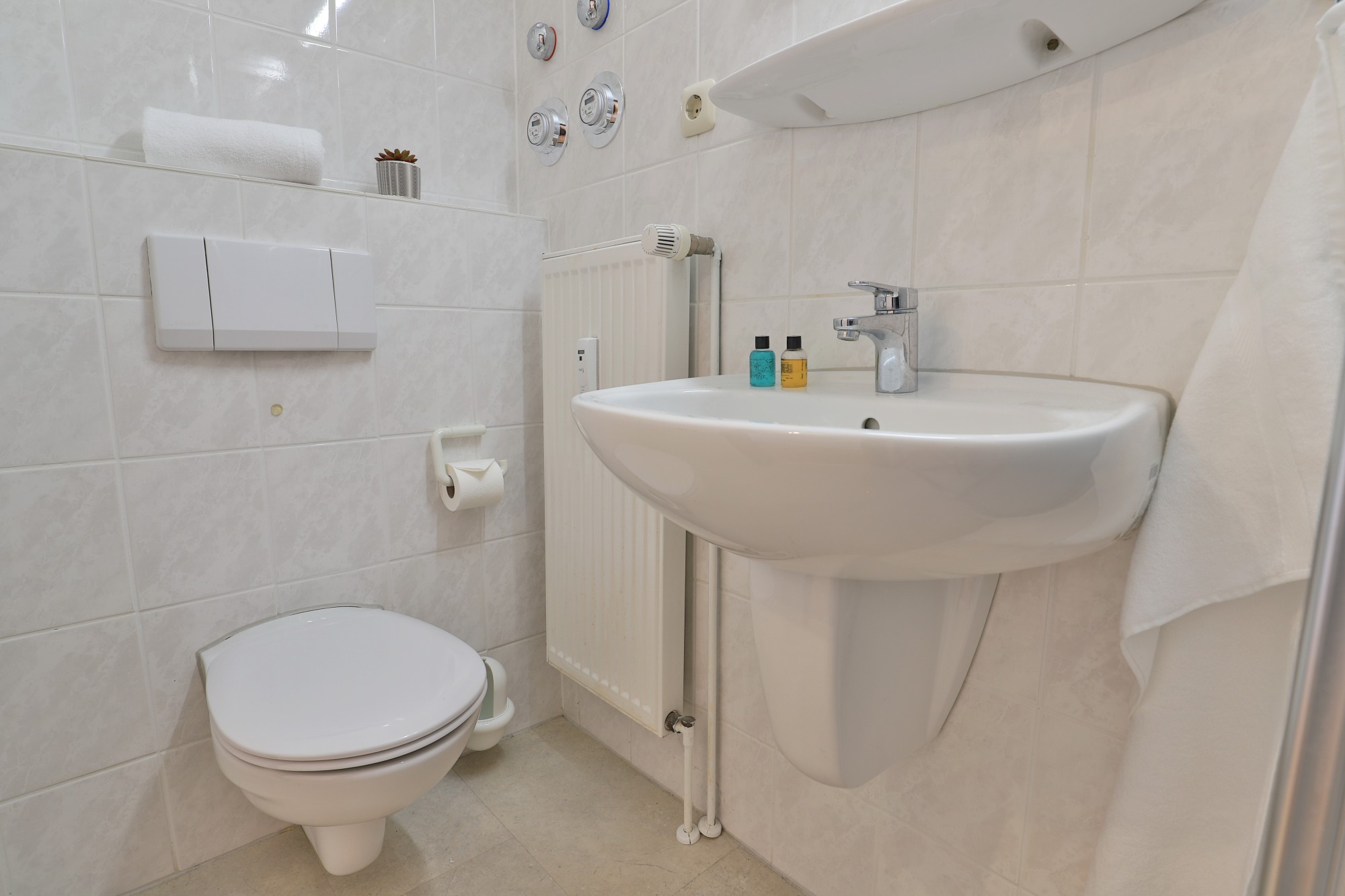 Das gepflegte Duschbad präsentiert sich in zeitgemäßer Optik und bietet alle Annehmlichkeiten für den täglichen Komfort.