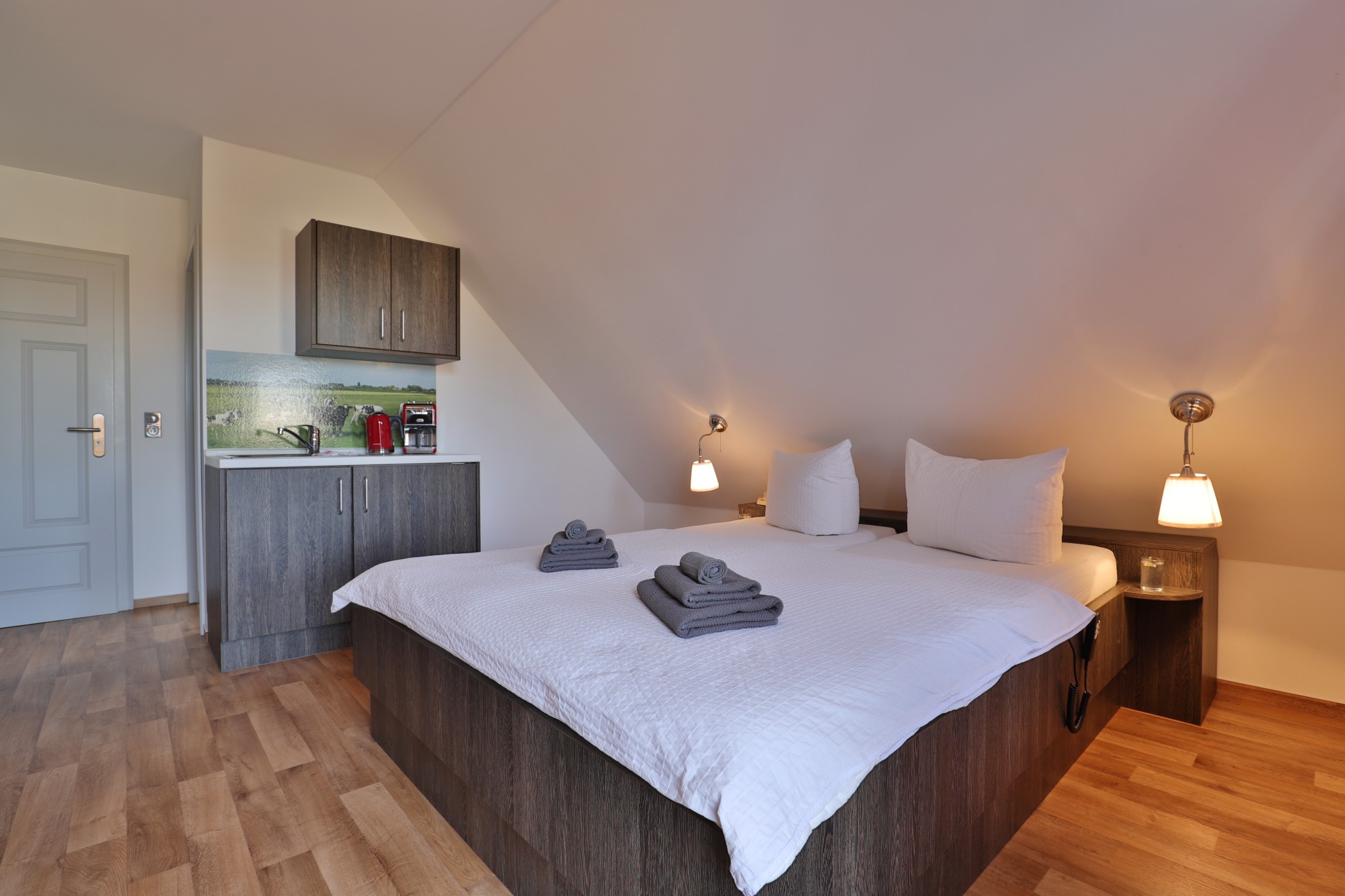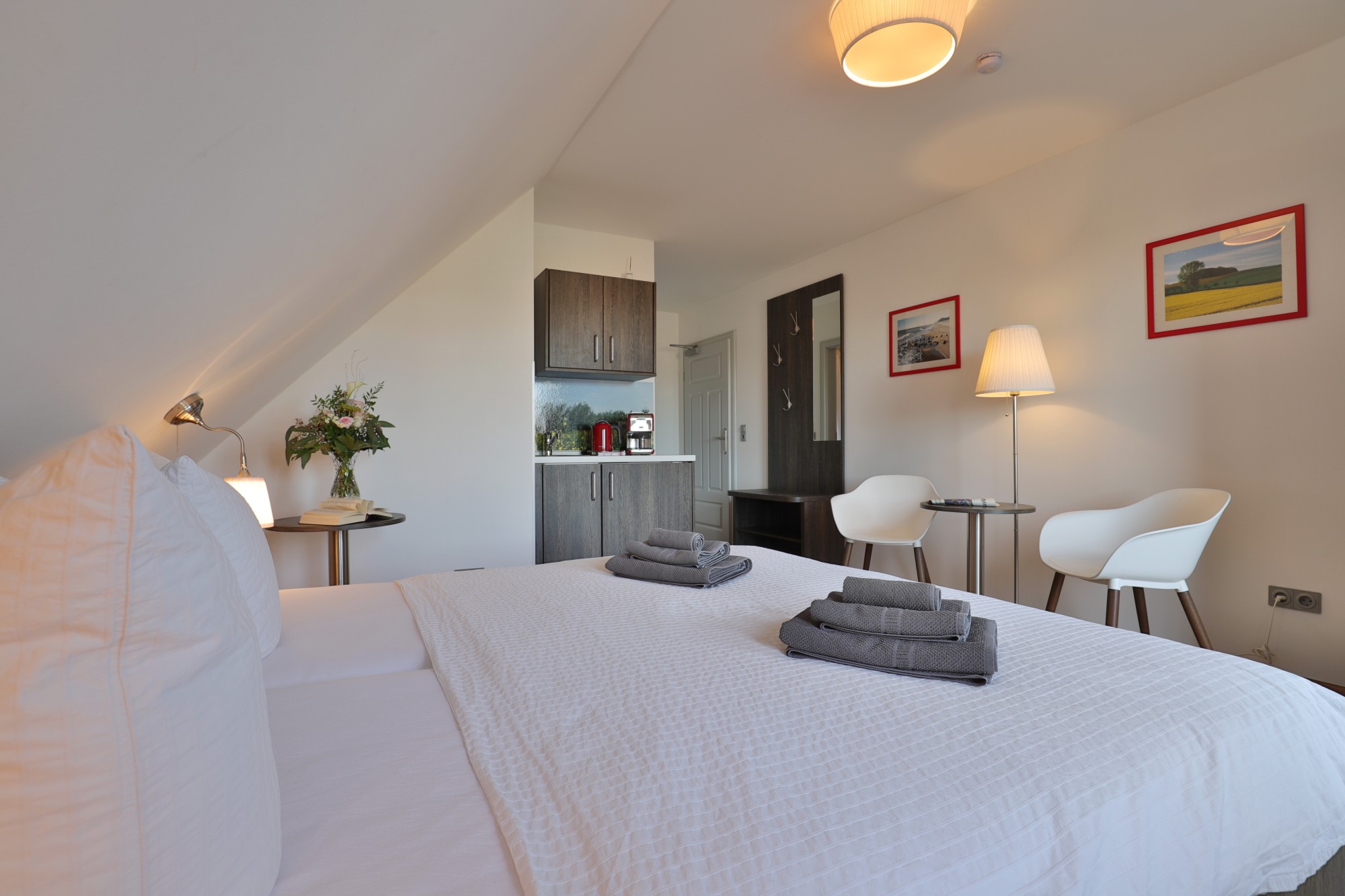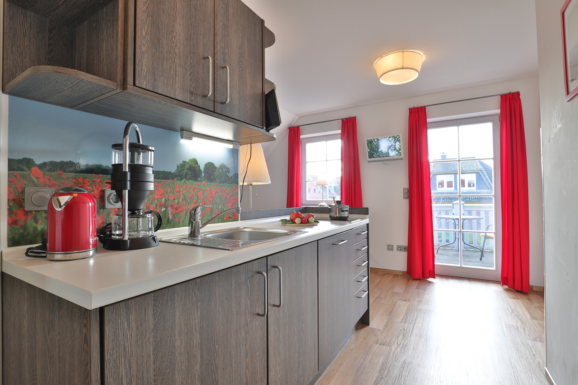 Über eine stilvolle Holztreppe erreichen Sie das Obergeschoss, in dem drei modern und liebevoll ausgestattete Apartments mit hotelähnlichem Komfort auf Sie warten. Diese sind optimal für die gewerbliche Ferienvermietung geeignet und werden bereits erfolgreich betrieben. Zwei der Apartments verfügen über ein kombiniertes Wohn- und Schlafzimmer mit integrierter Pantryküche (Kühlschrank ohne Gefrierfach) sowie ein Tageslichtbad. Das dritte Apartment bietet ein separates Wohnzimmer mit Pantryküche (Kühlschrank ohne Gefrierfach, Geschirrspüler, kleinem Kochfeld), ein Schlafzimmer und ebenfalls ein Tageslichtvollbad. Zwei der Apartments haben Zugang zu einem nach Norden ausgerichteten Balkon, während das dritte Apartment über einen Balkon in Südausrichtung verfügt.