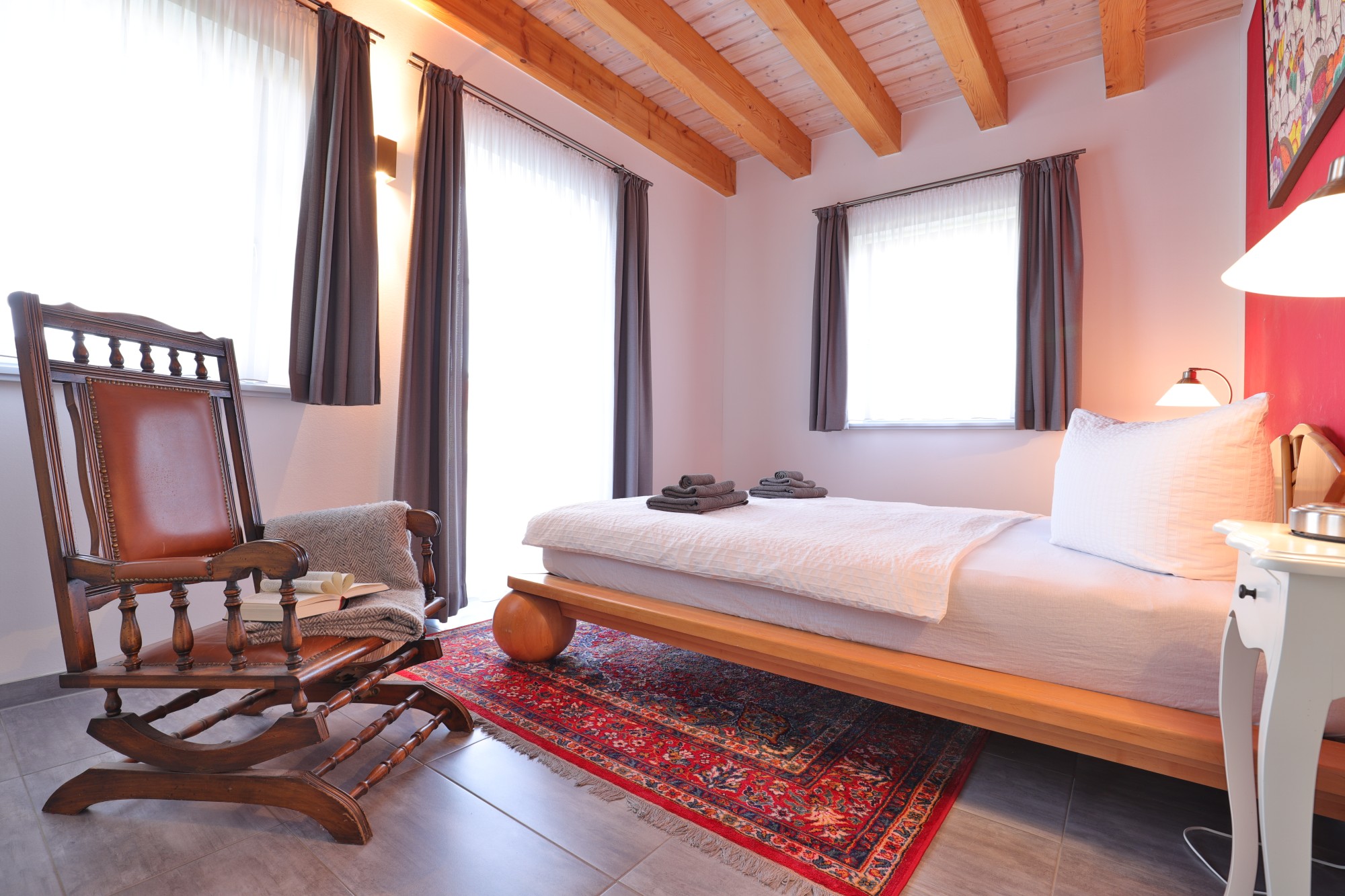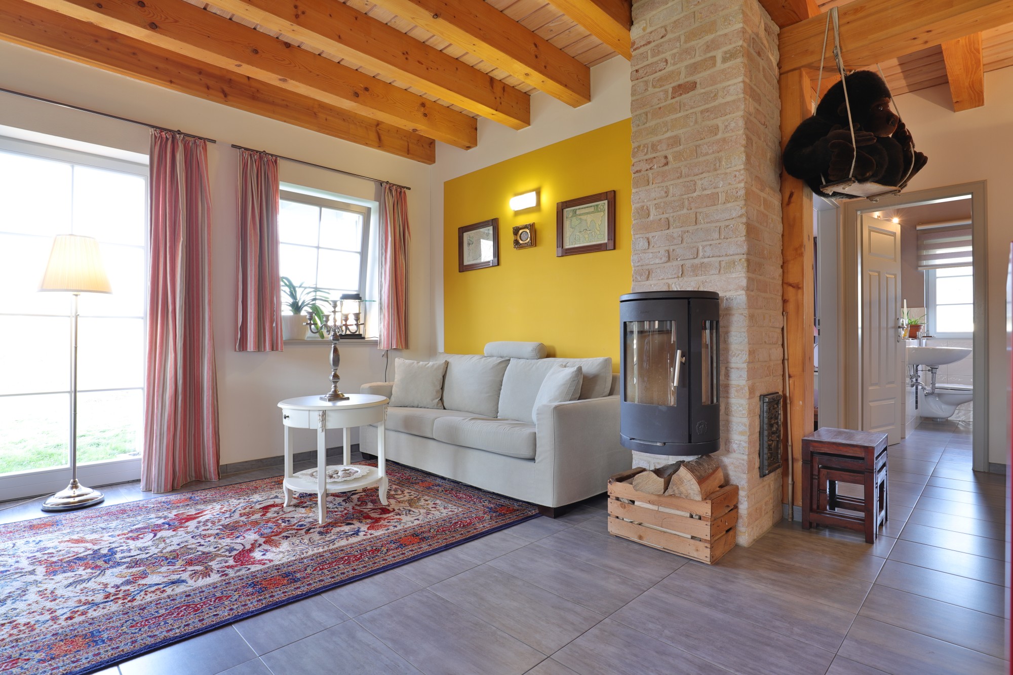 Die private Wohneinheit im Erdgeschoss bietet ein gemütliches Wohnzimmer mit Kamin und direktem Zugang zur teilweisen überdachten Terrasse sowie zum Garten, der zum Entspannen und individueller Gestaltung einlädt. Ergänzt wird dieser Bereich durch ein Schlafzimmer, ein Tageslichtvollbad sowie einen Hausanschluss- und Vorratsraum mit Waschmaschinenanschluss, in dem auch die technische Ausstattung des Hauses untergebracht ist. Auch hier sorgt eine sichtbare Holzbalkendecke für ein stimmungsvolles Wohnambiente.