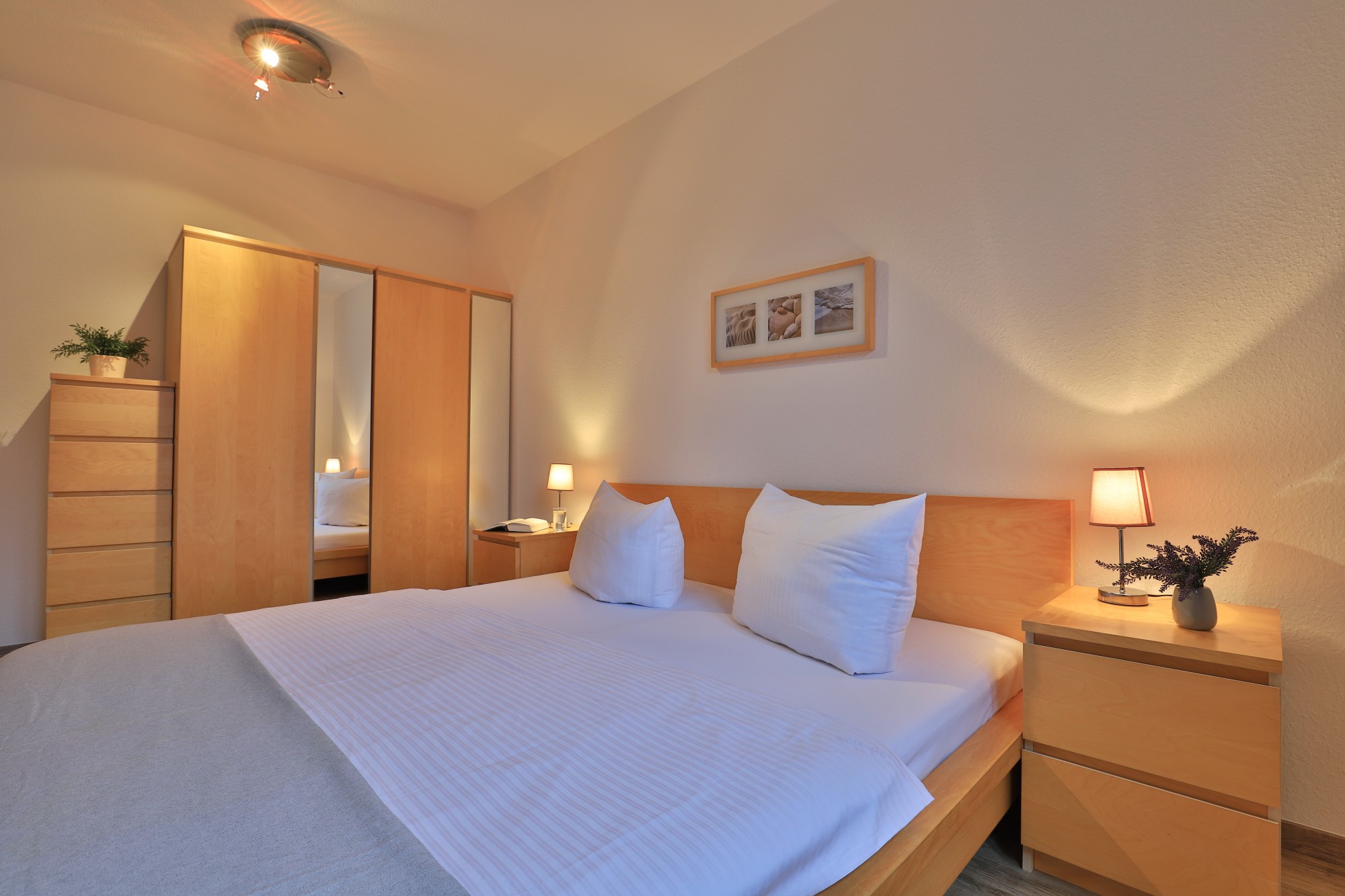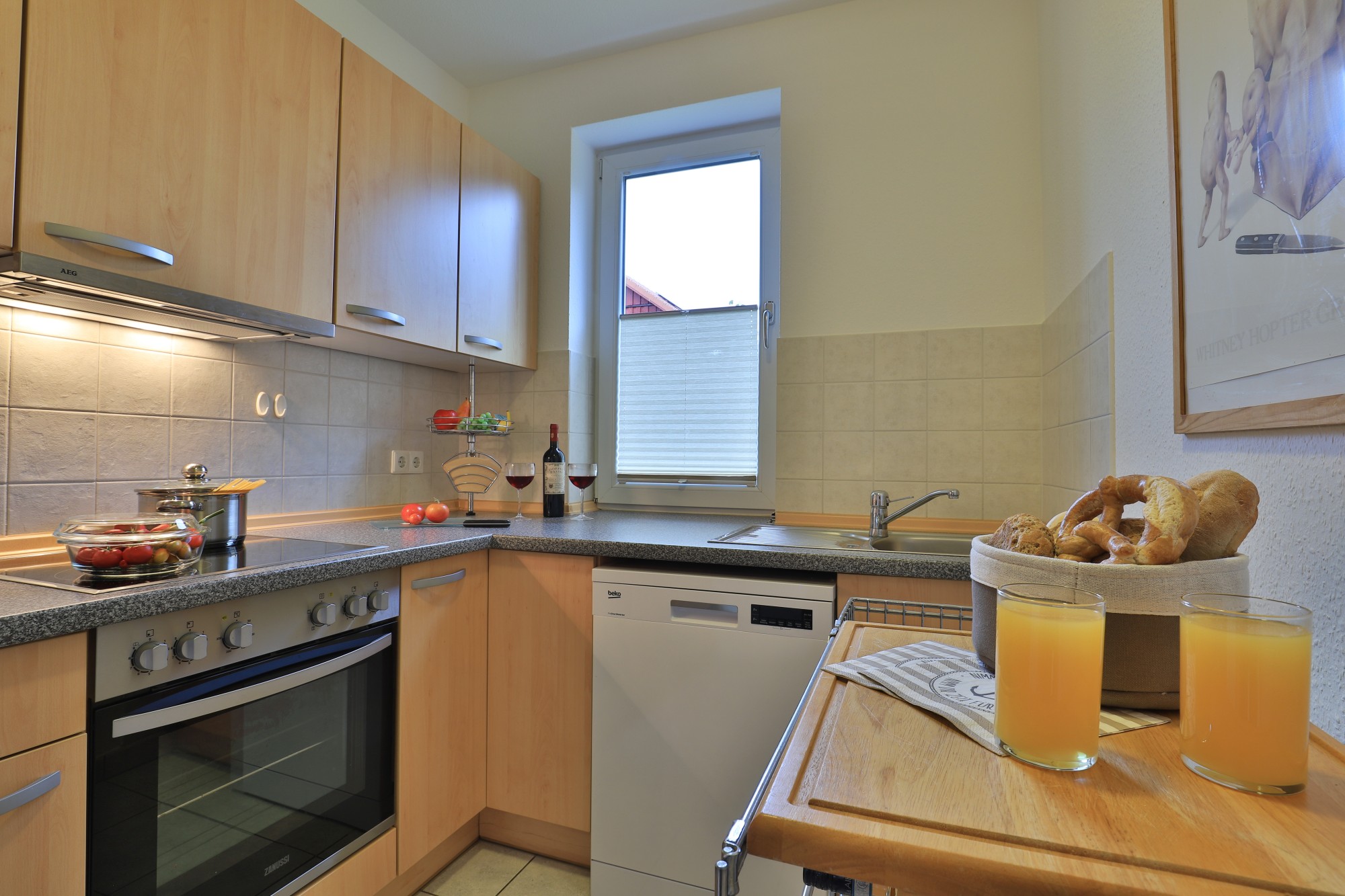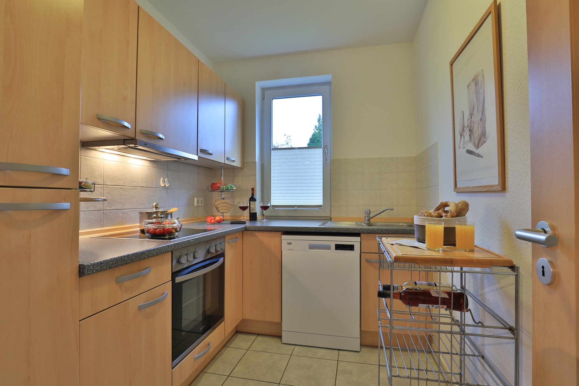 Die Grundrissaufteilung ist gut durchdacht und für die Nutzung mit bis zu 4 Personen sehr praktikabel. Das Wohnzimmer bietet mit seiner Sitzecke die besten Voraussetzungen für einen gemütlichen Aufenthalt. Zur weiteren technischen Ausstattung gehören ein Fernseher, ein Videorecorder, ein DVD- Player und eine Hifi- Anlage. Die Wohnung ist kinder- und familienfreundlich eingerichtet. Im Schlafzimmer befinden sich ein Doppelbett und ein geräumiger Kleiderschrank für Ihre Garderobe sowie ein zweiter Fernseher. Die separat angeordnete Küche ist mit einer Einbauküche (Kühlschrank, separater Gefrierschrank, Herd, Backofen, Geschirrspüler, Mikrowelle) ausgestattet. Im Tageslichtduschbad befinden sich auch eine Waschmaschine und ein Trockner.