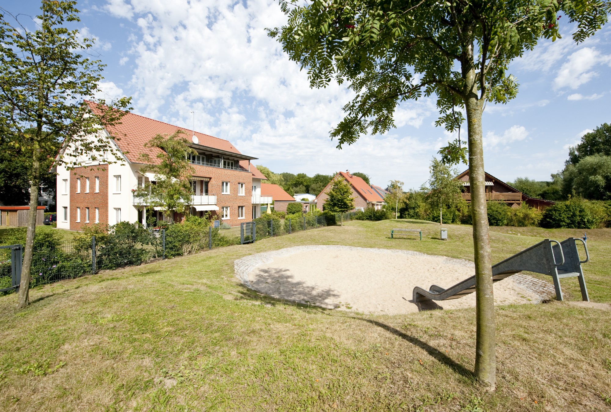 Die sehr geräumige und vollständig eingerichtete 2-Zimmer-Eigentumswohnung mit Terrasse liegt zur Südseite mit einem Blick auf die umliegende Landschaft und den nur für die Bewohner/ Besucher des Hauses zur Verfügung stehenden hauseigenen, umzäunten Kinderspielplatz.