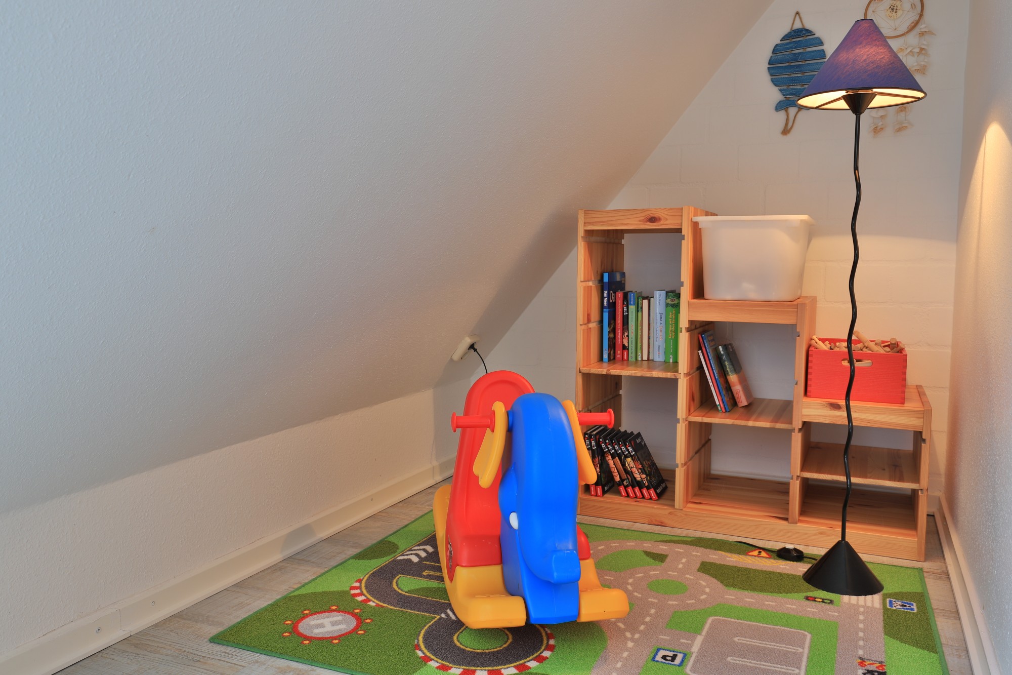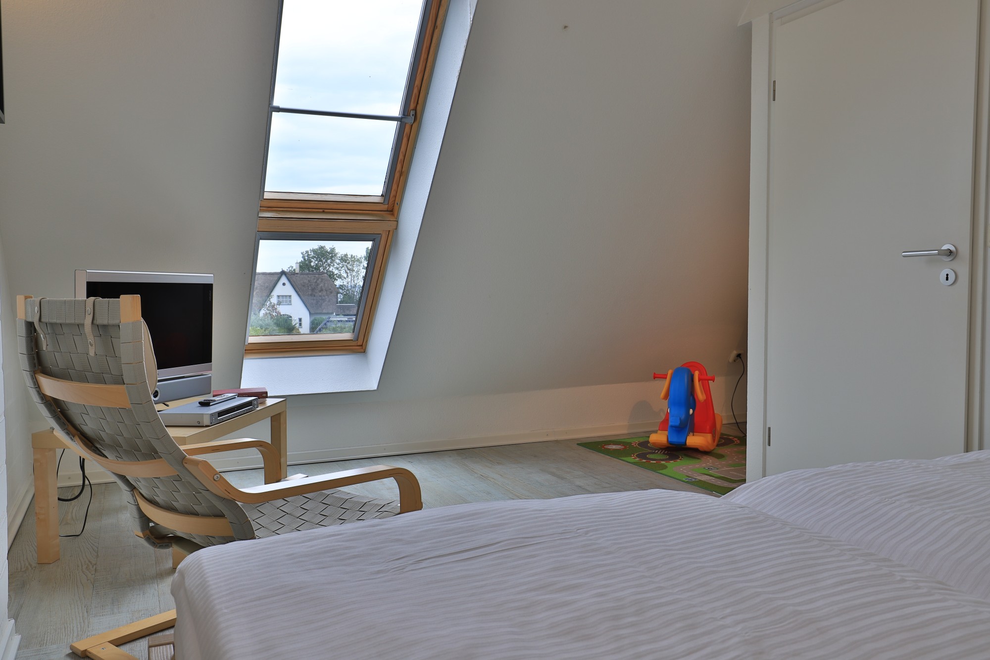 Das ausgebaute Dachgeschoss bietet Ihnen eine weitere Schlafgelegenheit, es ist mit einem Doppelbett sowie einer kleinen Spielecke für Kinder eingerichtet. Ein Einbauschrank bietet Ihnen Stauraum für Ihre Garderobe.
