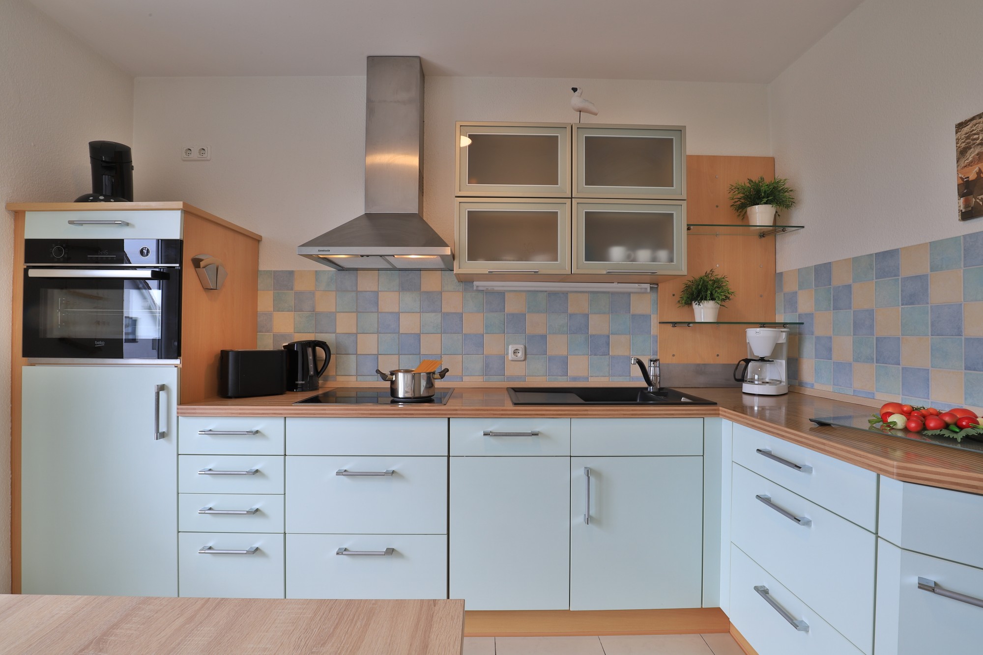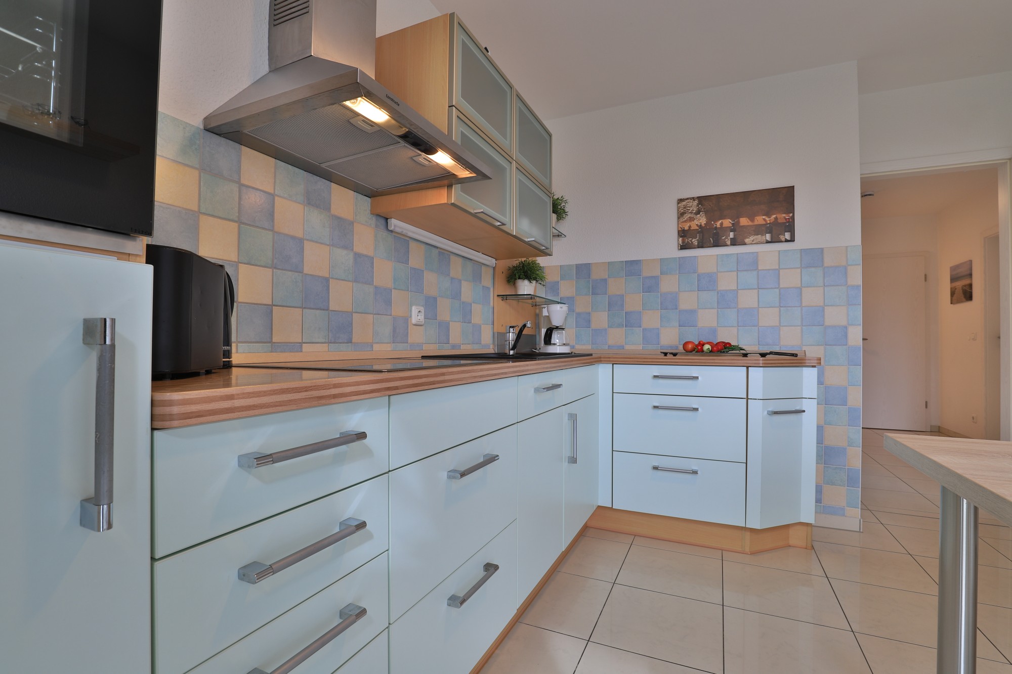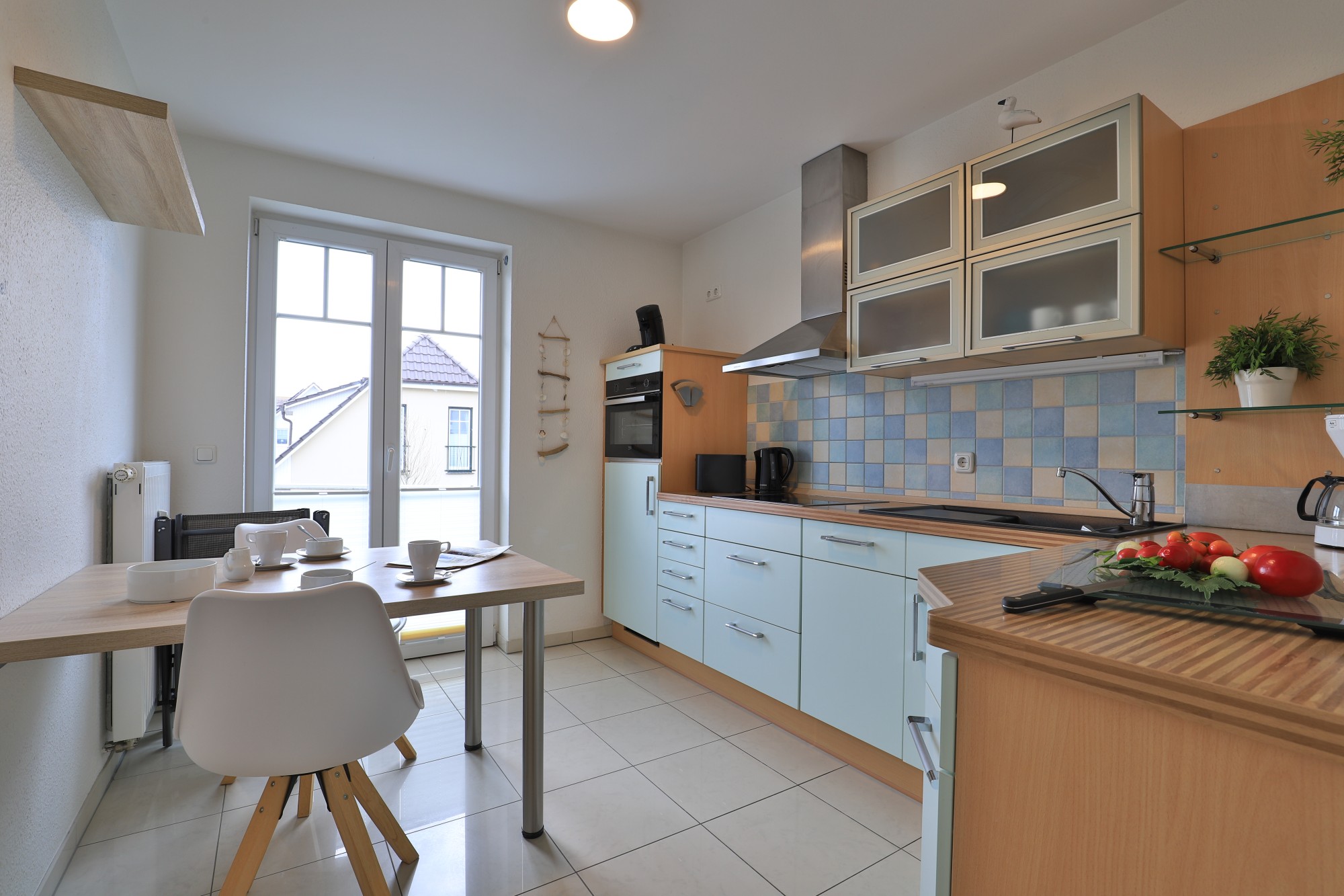 Die separat angeordnete Küche, die vorhandene Einbauküche - ausgestattet mit Geschirrspüler, Kühlschrank mit 3***-Gefrierfach, Backofen, Cerankochfeld, ist so konzipiert, dass ein Tisch für 4 Personen seinen Platz findet, und Zugang zum Balkon bietet, auf dem sich schon morgens herrlich Frühstücken lässt.