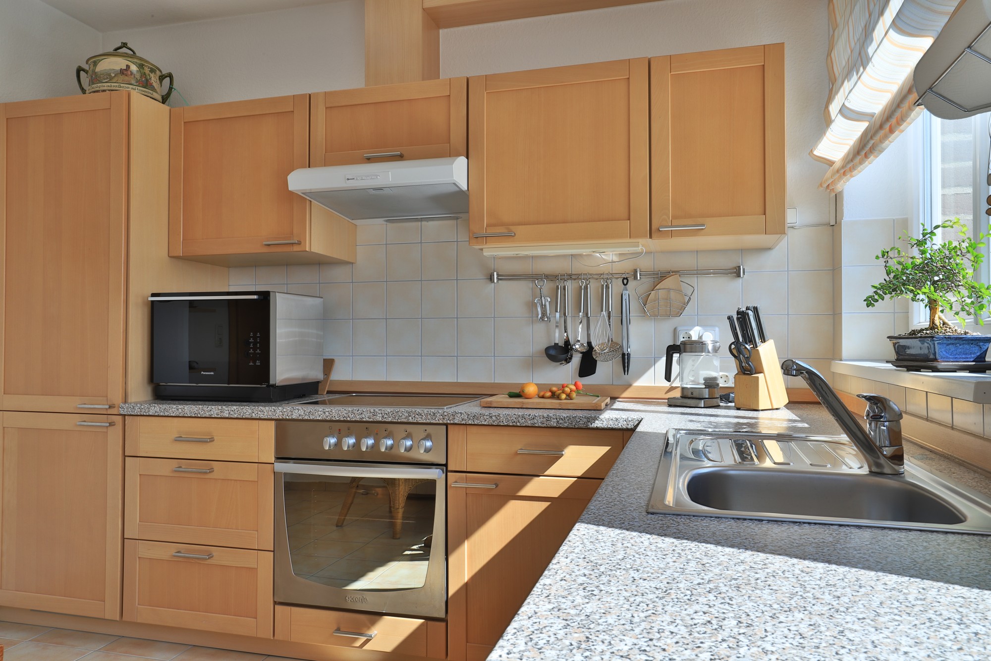Die ebenfalls vom Flur zugängliche separate Küche ist mit einer Einbauküche ausgestattet. Ein Ceran-Kochfeld und ein Backofen sind die praktischen Helfer bei der Zubereitung Ihrer Mahlzeiten. Ebenfalls vorhanden ist ein Kühlschrank mit Gefrierfach und ein Geschirrspüler. Am Küchentisch begrüßt Sie bereits die Morgensonne bei Ihrer ersten Tasse Kaffee. Im neben der Küche befindlichen Hauswirtschafts-/ Abstellraum können z.B. Vorräte und andere Utensilien verstaut/ gelagert bzw. ein vorhandener Waschtrockner genutzt werden.