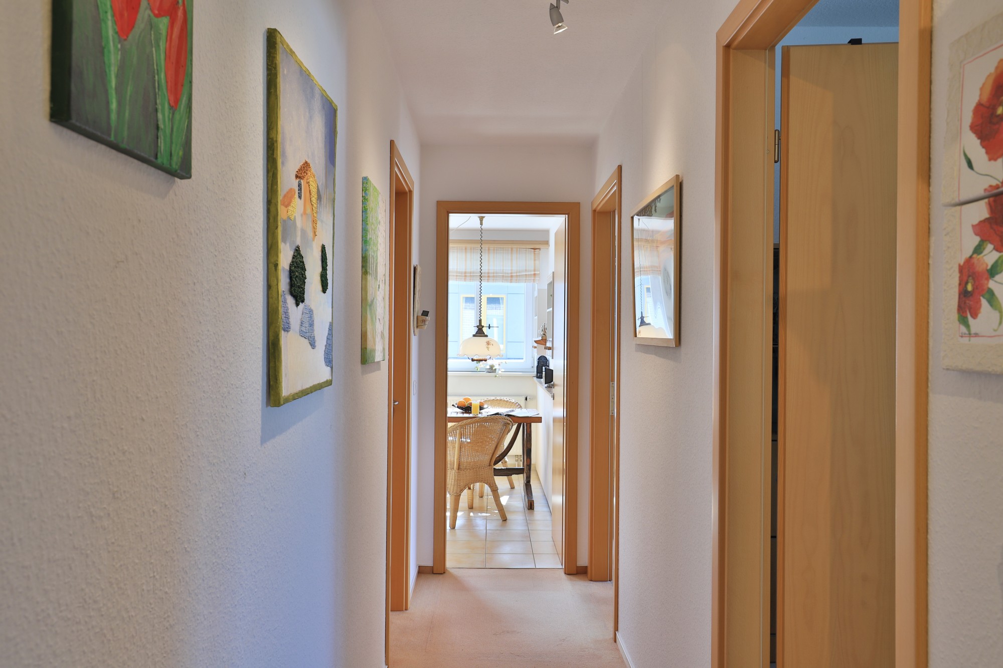 Beim Betreten der Wohnung gelangt man zunächst in einen Flur, von dem alle Räume zugänglich sind. Das innenliegende Vollbad ist mit einer Badewanne, Dusche, Waschtisch und, WC ausgestattet. Gegenüber liegend befindet sich das großzügige Schlafzimmer, welches mit einem Doppelbett und großem Kleiderschrank ausgestattet ist. Das geräumige Wohnzimmer, welches mit einem gemütlichen Ecksofa, auch Schlafsofa ausgestattet ist, ermöglicht Ihnen den Zugang zum Balkon in Südwestlage mit Blick auf die umliegende Neubaubebauung sowie die dahinterliegenden Haffwiesen. Hier den ganzen Tag verweilen. An sehr heißen Tagen im Jahr spendet eine Markise Schatten und bietet Schutz bei leichten Regenschauern. Der Balkon würde auch Platz für das Aufstellen eines Strandkorbes ermöglichen.