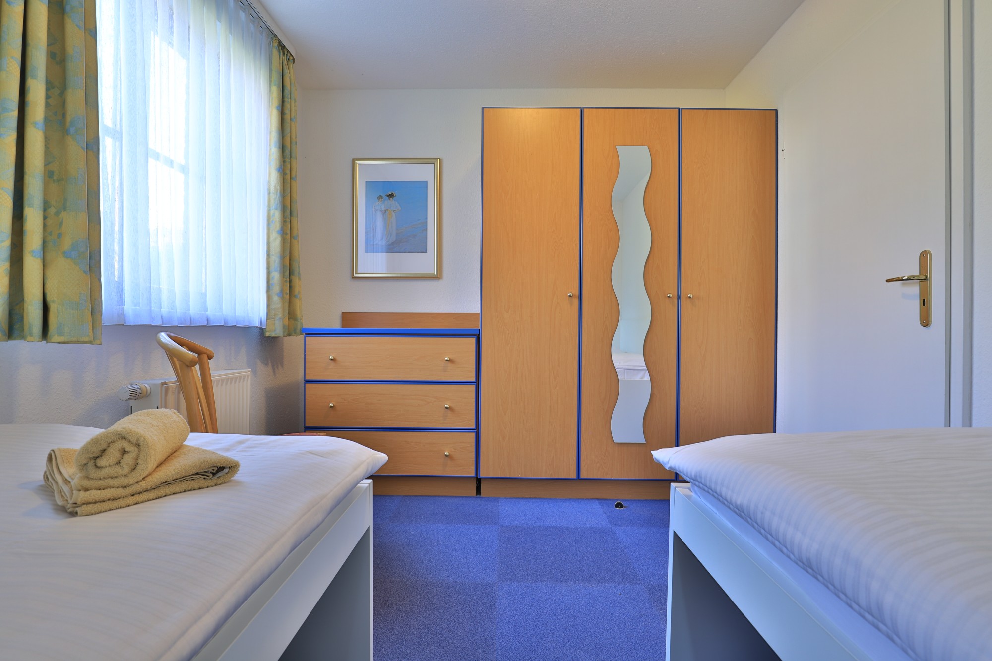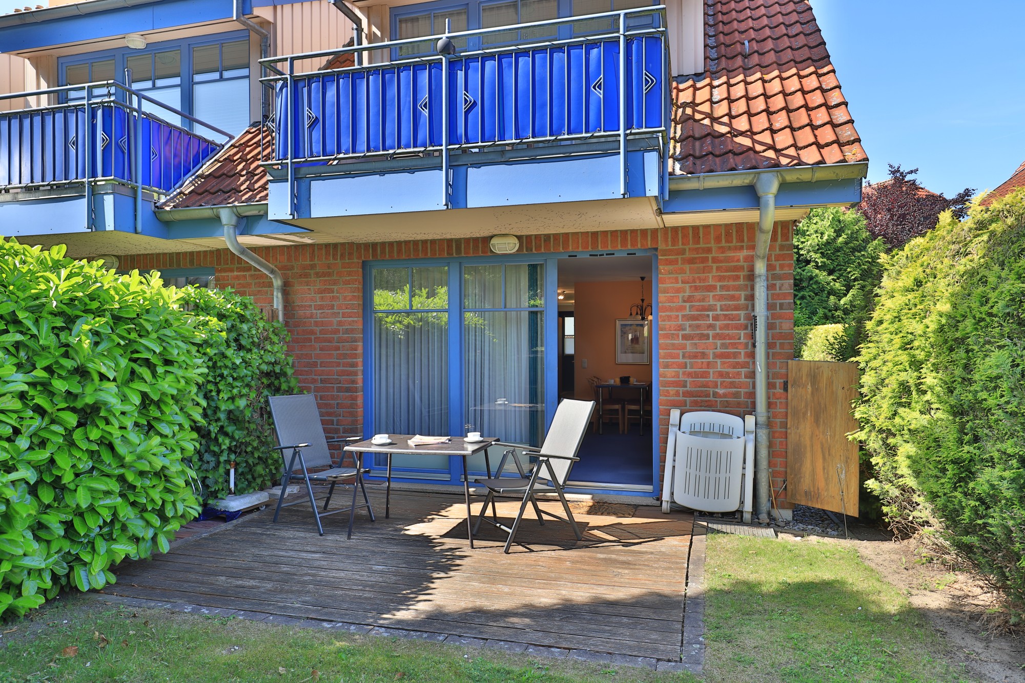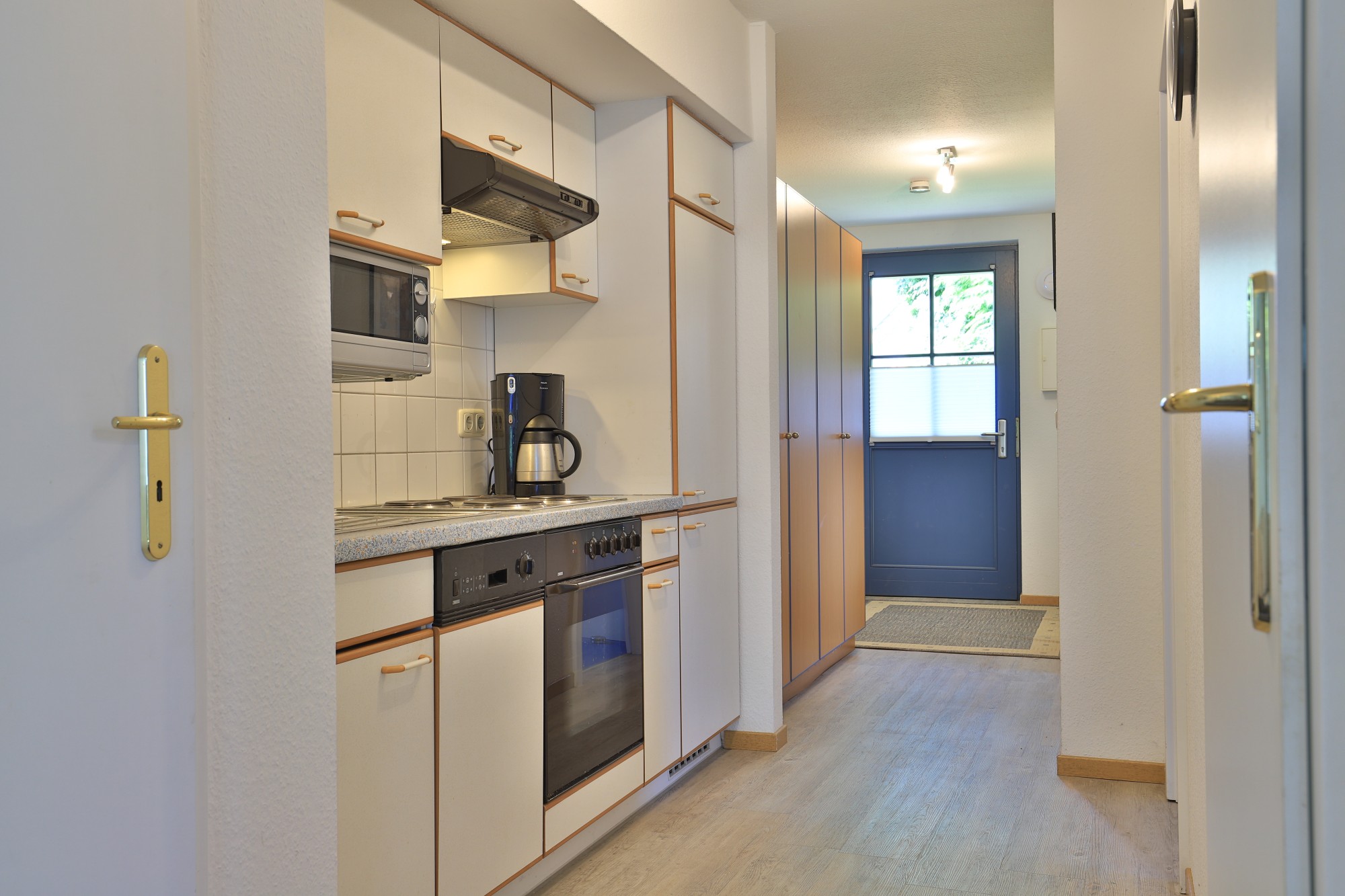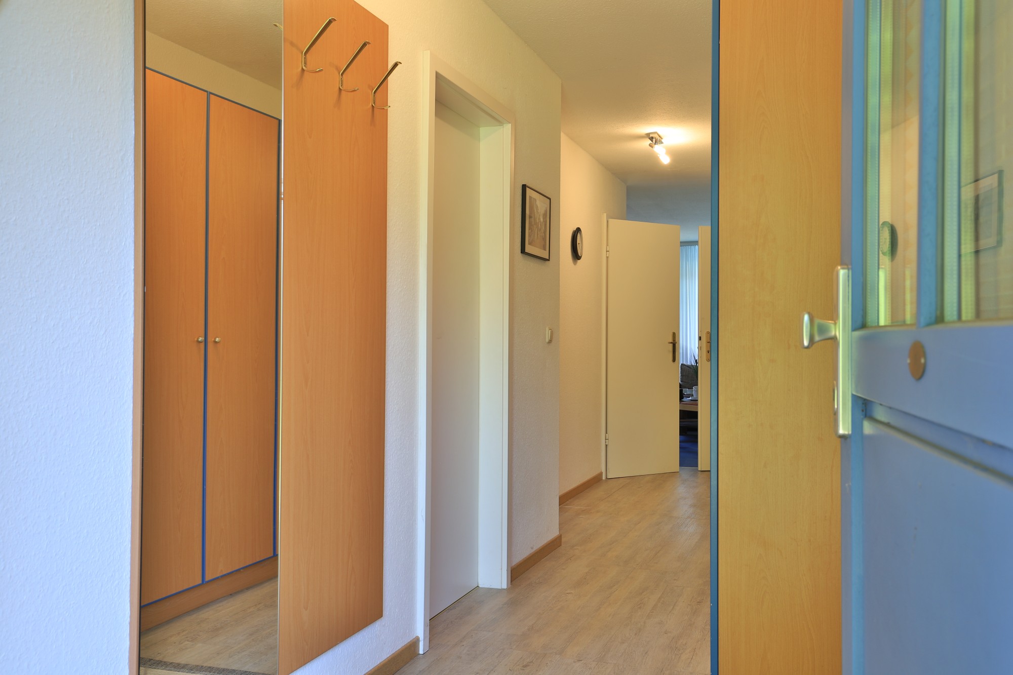 Das Appartement ist ein außenliegendes Appartement, welches unterteilt ist in: einen Flur mit Stauraum für Ihre Garderobe, ein Wohn-/ Esszimmer mit Zugang zur Terrasse in Südostausrichtung, ein Schlafzimmer, ausgestattet mit zwei Einzelbetten, einem Kleiderschrank sowie einer Kommode, ein Duschbad mit Dusche, Waschtisch mit Unterschrank, WC und Waschmaschine sowie ein separater Abstellraum für die mögliche Unterbringung von Haushaltsgeräten und weiterem für die Wohnung benötigtem Zubehör. Die vorhandene Küchenzeile (Einbauküche mit Herd, Backofen, Kühlschrank mit ***-Gefrierfach, Geschirrspüler u.m.) ist zwischen dem Eingangsbereich und dem Wohn-/ Esszimmer angeordnet.