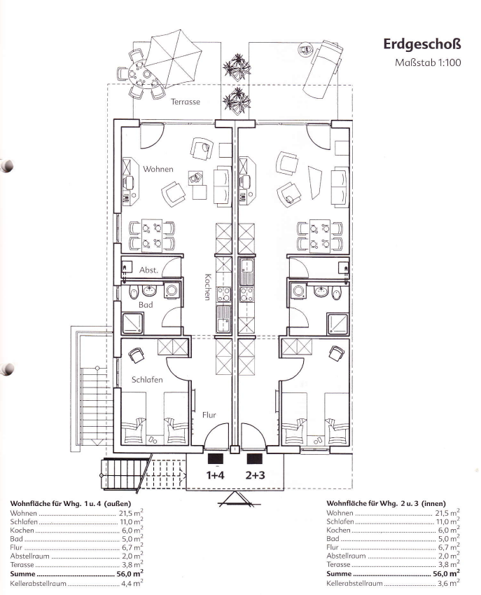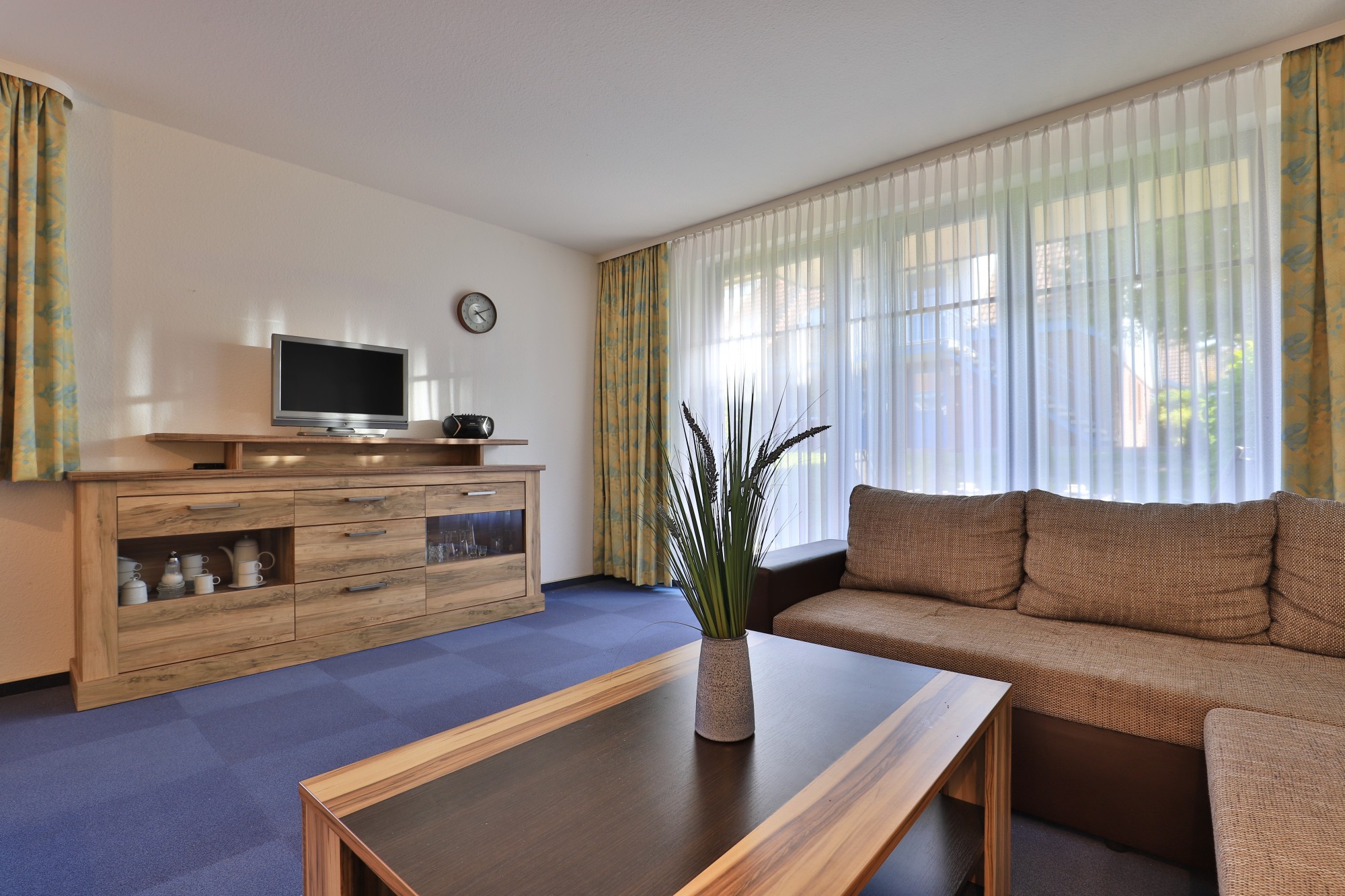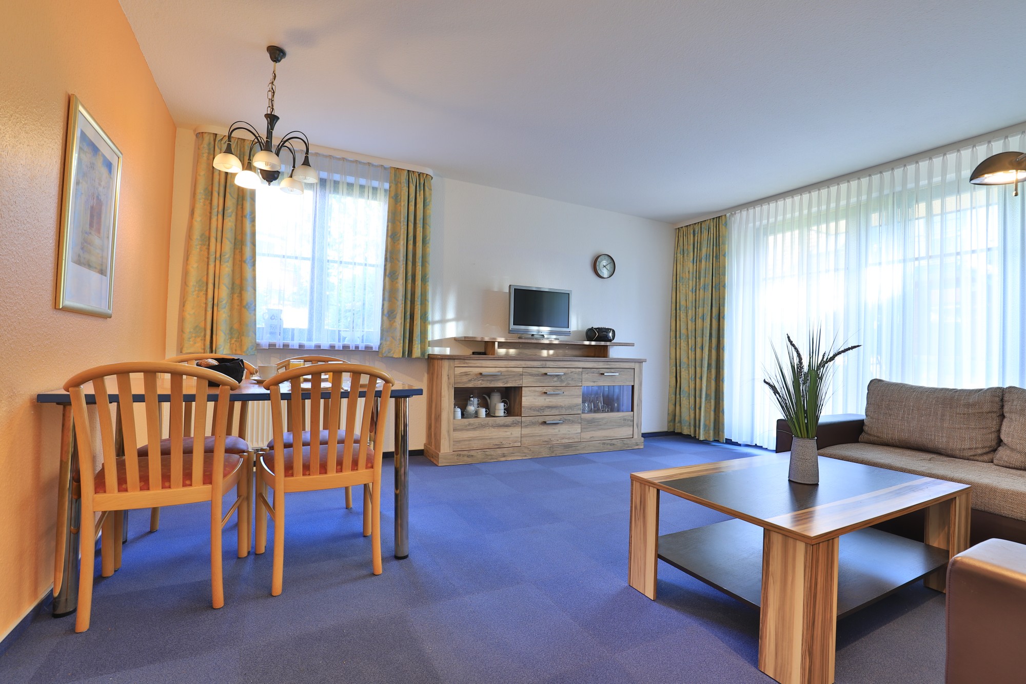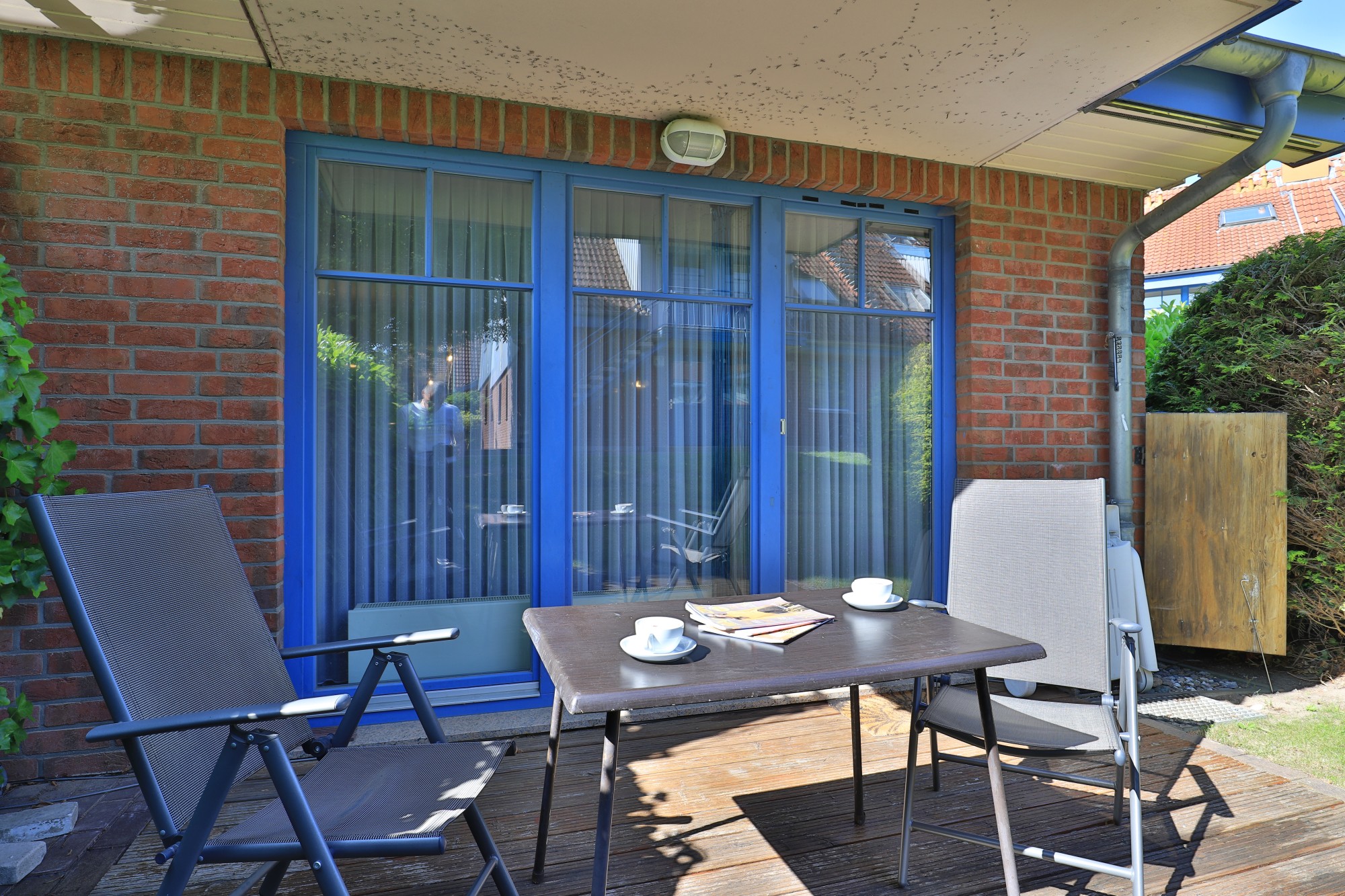 Das Appartement ist ein außenliegendes Appartement, welches unterteilt ist in: einen Flur mit Stauraum für Ihre Garderobe, ein Wohn-/ Esszimmer mit Zugang zur Terrasse in Südostausrichtung, ein Schlafzimmer, ausgestattet mit zwei Einzelbetten, einem Kleiderschrank sowie einer Kommode, ein Duschbad mit Dusche, Waschtisch mit Unterschrank, WC und Waschmaschine sowie ein separater Abstellraum für die mögliche Unterbringung von Haushaltsgeräten und weiterem für die Wohnung benötigtem Zubehör. Die vorhandene Küchenzeile (Einbauküche mit Herd, Backofen, Kühlschrank mit ***-Gefrierfach, Geschirrspüler u.m.) ist zwischen dem Eingangsbereich und dem Wohn-/ Esszimmer angeordnet.