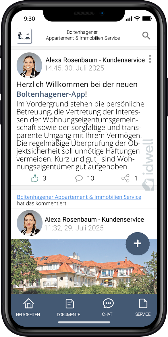 Unkompliziert. Persönlich. Nah. Der Aufzug ist defekt, das Licht im Treppenhaus brennt nicht mehr oder Sie haben eine Frage zur Abrechnung? powered by iDWELL zu melden - inklusive Fotoanhang! Wir halten Sie über den Bearbeitungsstatus Ihrer Anfrage auf dem Laufenden. Zusätzlich haben Sie jederzeit wichtige Dokumente zu Ihrer Immobilie griffbereit. Sie mit Sicherheit immer auf dem neuesten Stand zu Themen rund um Ihre Immobilie(n). Wie erhalten Sie Zugriff zur iDWELL App? ● Sie erhalten von uns eine E-Mail mit einer persönlichen Einladung zum Beitritt der iDWELL App ● Drücken Sie auf den Button “Anmeldung bestätigen” und geben Sie Ihr persönlich gewähltes Passwort ein ● Laden Sie sich die iDWELL App für Ihr Mobiltelefon für Android oder iOS herunter oder benutzen Sie diesen Link: https://immo-boltenhagen.idwell.com ● Und schon können Sie alle Vorteile unserer digitalen Dienstleistung nutzen! Sie haben von uns keine Einladung via SMS oder E-Mail erhalten? Dann melden Sie sich bitte bei uns, damit wir Sie freischalten. ● Transparenz ist uns ein Anliegen. Auf der App finden Sie alle wichtigen Dokumente zu Ihrer Liegenschaft. Profitieren Sie von mehr Übersicht und ständiger Verfügbarkeit. ● Effizienz gehört zu unserem Tagesgeschäft. Ihre Schadensmeldungen und sonstige Anliegen werden rasch bearbeitet und Sie erhalten regelmäßig per Push-Nachricht ein Status-Update. ● Dokumentation ist für uns die “halbe Miete” Mit der App erhalten Sie alle wichtigen Informationen zu Ihrer Liegenschaft direkt am schwarzen Brett und können diese jederzeit abrufen. ● Ihre Mobilität und Zeitersparnis stehen im Fokus. Informieren Sie sich zu jeder Zeit und an jedem Ort rund um Ihre Immobilie auf der Immo Boltenhagen App powered by iDWELL. |
